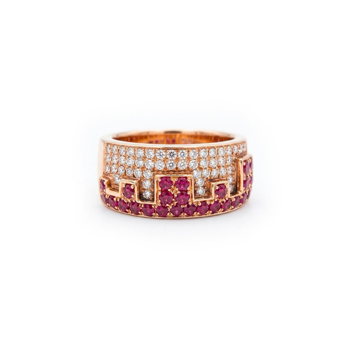 Anello uomo "New York" in oro rosa 18kt di gr. 14,60 con incastonati diamanti brown del peso totale di ct.0,92 e rubini del peso totale di ct.1,75.